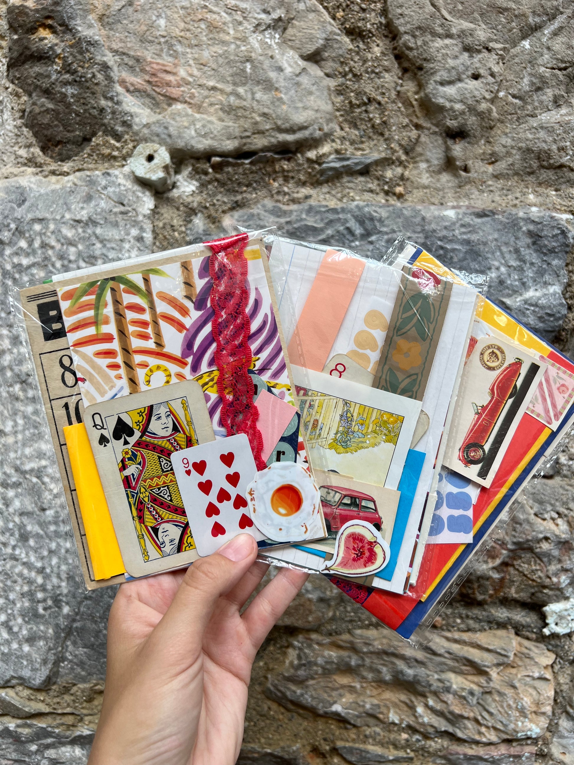 In this kit you will get randomised stickers; odd and some of our own, coloured paper, tissue, postcards and more crafty fun bits and bobs to make the cutest pages of your dreams!