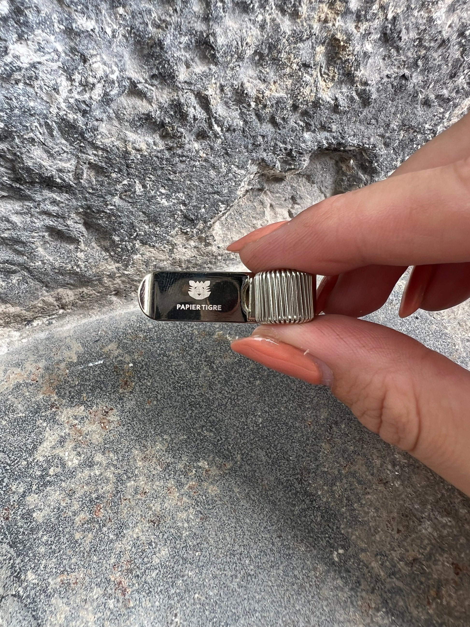 The Papier Tigre Pen Clip is a versatile accessory designed for convenience and style. Available in Silver, this durable steel clip fits any notebook size and style. It holds anything from a pencil to a 1.4 cm diameter Ballpoint pen securely. The flexible ring adjusts to the thickness of the writing tool, while the clip also doubles as a handy bookmark. Ideal for anyone who values function and design.
